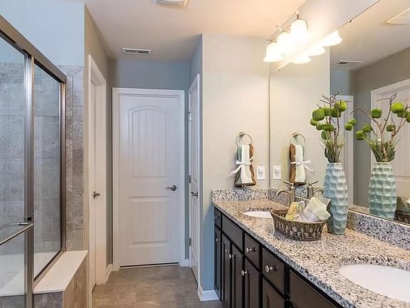 The oversized primary bedroom upstairs includes a gorgeous en-suite bathroom with double vanity, a separate toilet room, walk-in tiled shower, and walk-through closet. Upstairs is rounded out by 2 additional bedrooms, a hallway bath with tub, and a laundry closet. Neighborhood includes fantastic pool and playground.