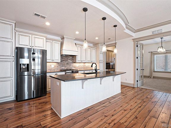 Immerse yourself in the elegance, space, and comfort of this luxurious condo in a central Fort Collins location! Exuding a timeless character, its interior displays stately crown molding and decorative baseboards accentuating the neutral color palette. Multiple windows, volume ceilings, and rich hardwood-style flooring lend a bright, welcoming vibe to the living room where you can entertain guests by the raised-hearth brick fireplace. Fully equipped for the home chef, the open-concept kitchen showcases stainless steel appliances, granite countertops, handsome cabinetry, and a dramatic backsplash. Take advantage of the large pendant-lit island's extra seating and prep space.