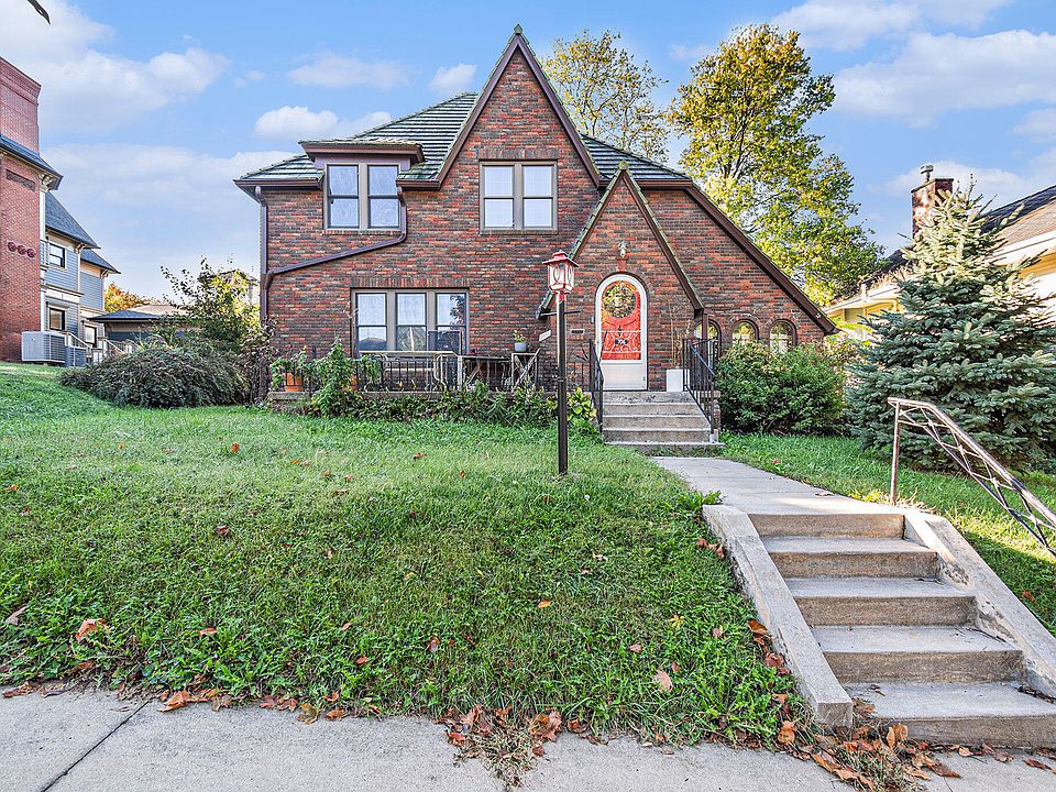 French doorsTudor-style brick homeOriginal woodworkGranite countertopsElegant crown moldingLudowici tile roof