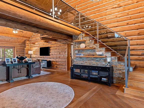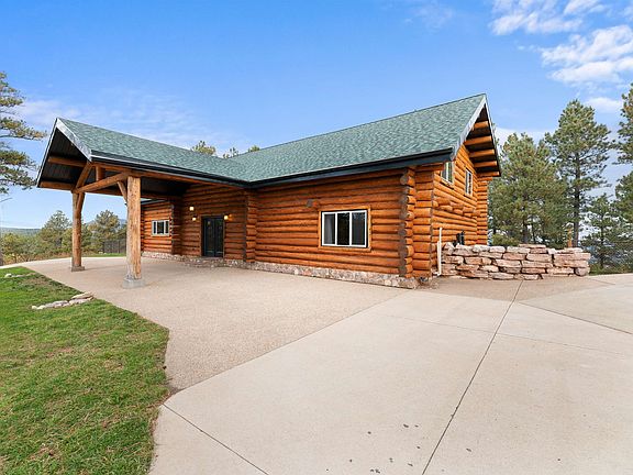 Contact listing agents Scot Munro 605-641-6482 or Heath Gran 605-209-2052 with Great Peaks Realty. Views from the top can be yours in this 5 bedroom, 4 bath log home situated in Mountain Plains 2. Towering pines are scattered across the 2.89 acre property peacefully located at the top of the subdivision, and a circular drive leads you to the 3 car garage. High-end amenities are abundant throughout the property, and updates include new Grade 5 hail-resistant shingles, interior railings, bathrooms, and new furnace. Inside the home, exposed logs, open beams & rich colors enhance the space. The oversized living and dining rooms both give access to the back deck, and the 2nd story loft is multi-functional as an office or library. The kitchen comes equipped with new appliances and flooring, plus has a mobile center island & ample cabinet storage. The tranquil master suite boasts a private outdoor balcony, huge walk-in closet, and custom bathroom with walk-in shower and dual sinks. Two additional bedrooms are found on the main floor, one of which is an Ensuite with tiled shower, plus 2 more large bedrooms are found downstairs. Also downstairs, relax with family & friends in the fully equipped theatre room with wet bar, or sprawl out in adjoining craft or exercise room, both with new flooring and fresh paint. With all these features, just minutes from downtown Spearfish, this home is a must-see!