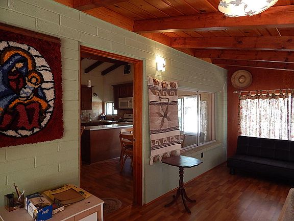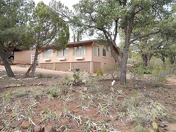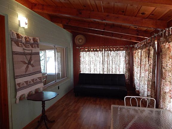 Cherished cozy cabin backs the NFS and is a 1BDRM/1BA/2CP with 1033sf. Enclosed front porch entry features laminate wood floors and windows galore. Beautiful, open great room living with wood stove, updated kitchen with gas range, refrigerator and dining.This bedroom is large and so is the full bathroom. Vaulted ceiling with beams, bonus room off Great Room, laundry room and all electric heating and cooling with forced air. Side patio, Gazebo with views of the Rim and all backing the National Forest! Nice workshop area and double carport. This is cabin living at it's best.