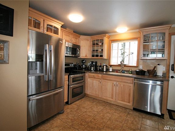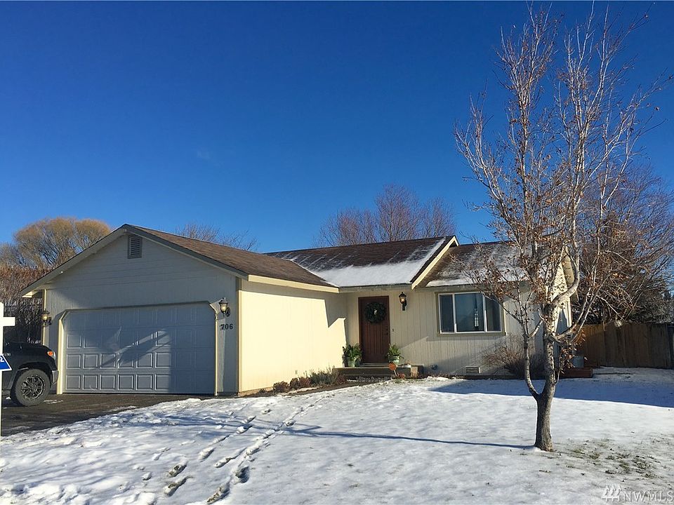 Upgraded home with 3 bedrooms & 1 /2 baths. The recently remodeled kitchen has new cabinets, solid surface counters, tile floor & stainless appliances-All included! (Refrigerator/Stove with double oven/micro/DW/NEW garbage disp. AND wshr & dryer) Kitchen is open to the living room. Wood doors throughout. New Mini Split heat pump(AC). Hall bath w/ tile tub surround & granite counter. Master suite w/half bath. 2-car garage w/new door. Big fenced yard w/storage shed. Wonderful home near schools!