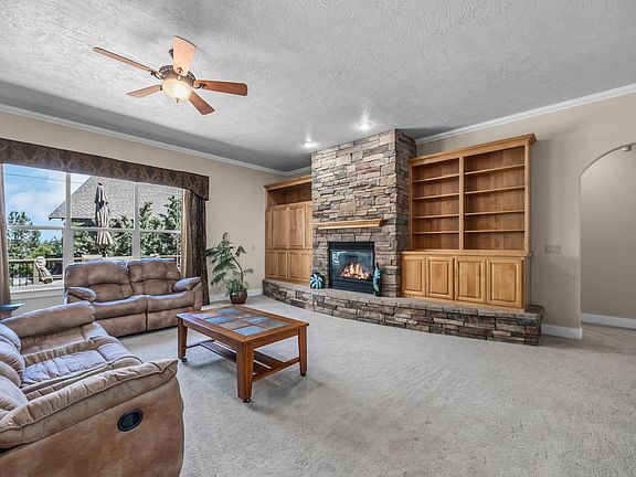 You will love this beautiful home in The Ridge at Eagle Crest, it would be perfect as a vacation home/rental property or a primary residence. You'll enter into a large open living area with a propane fireplace and tons of built ins surrounded by stone. The dining room and kitchen has beautiful cherry hardwood floors. The laundry room, has built in storage, a utility sink and leads to an oversized 3-car garage. Work from home in the large office with double doors or utilize it as a 5th bedroom, as it has a closet. On the main floor there is a primary suite with a jetted soaking tub, tiled walk in shower, double vanity and spacious walk in closet. On the opposite side of the home there are 2 guest rooms and a full bathroom while upstairs has a second primary suite. Everyone will have fun with 3 sports centers, 3 18-hole golf courses and miles of trails to explore. You need to see this one to take in the beautiful scenery with it's own water feature in the front yard.