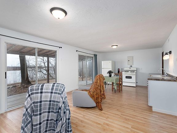Looking for your first home, an Airbnb opportunity or a place to retreat by the water with a beautiful view, beach access and close encounters with nature like eagles, pelicans, herons and cranes? This quaint one bedroom home sits high above the water, offering spectacular views and access to the Mississippi. You'll love the wall of sliding glass doors that lets in ample amounts of natural light, the open kitchen and living space, the hard-lined, whole house, gas generator; the deck that overlooks the water and the boat launch, situated close to the property. The oversized, 2 car, heated garage offers an RV electrical hook-up and a workbench. While the property is on public water and sewer, there is also a sand point well in the front yard for watering purposes. Tankless water heater, 2015. Roof with 50 year, one-time transferrable warranty and central air unit, 2022. Updates in the kitchen and bath, new lighting throughout, repaired, skim-coated and primed drywall; new front door, recently repaired and anchored steps and railing to beach access; updated electrical receptacles, switches and wiring.