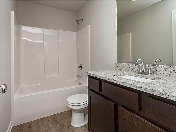 Affordable, open ranch plan features 3 beds, 2 baths, 2 car garage w/ openers & 1,415 SF, located on quiet family friendly street. Split bedroom plan w/ 2 beds & bath at front of home leading into the vaulted living room. Spacious kitchen includes stained cabinets, granite countertops, center island & SS appliances w/ refrigerator included! Waterproof/Scratch resistant LVP flooring in Kitchen-dining-baths-laundry-entry. Master suite is tucked away in back corner of home for privacy & includes tray ceiling, fan/light, double vanity, walk-in shower & walk-in closet. Off the garage entrance is the laundry room w/ big mudroom bench. The basement is ready for future finish to include living room, pre-plumbed for full bath, & 1 bed w/ egress window. Exterior features of home include no maintenance vinyl siding, 30 yr. shingles, cultured stone, covered stoop, back yard patio, fully sodded yard, & tree. Home is HERS energy certified & comes w/ 1 yr. builder warranty.