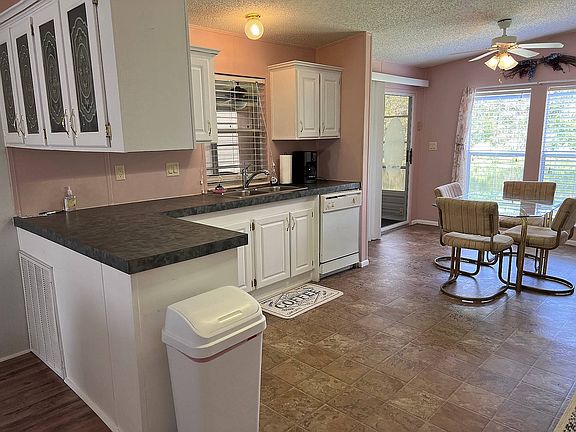 Here is a very nice 2 bed, 2 bath WATERFRONT home with all new laminate flooring, fully furnished, turnkey on a lovely pond. This home features a side lanai looking out over the tranquil pond with sliding glass doors leading into your eat in kitchen that also overlooks the pond. You will find a lovely living room and the 2 bedrooms (split plan for privacy), all offer comfort and are very accommodating. Laminate floors throughout with tile in kitchen means NO carpeting to deal with. The carport can fit your car and your golf cart that is included in the sale. A decent sized shed rounds out this nice home. Lets not forget the laundry room is inside the home too...no going outside to the shed to do laundry. Call today!!