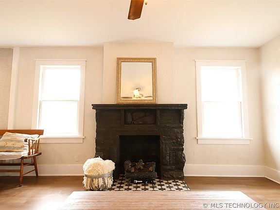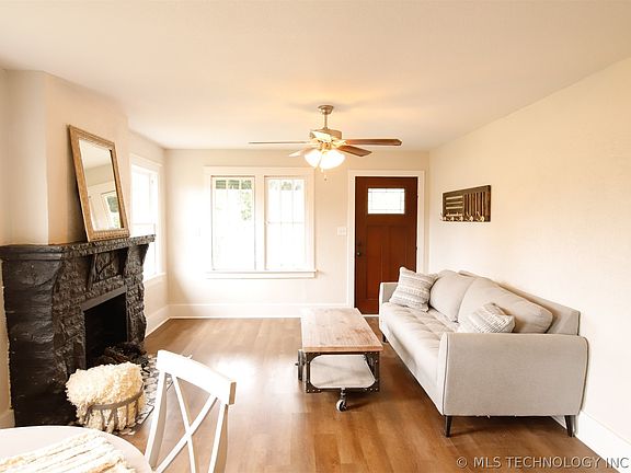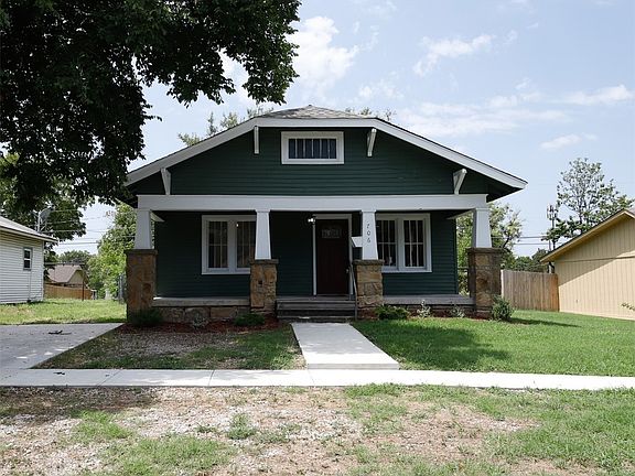 Adorable Remodeled Bungalow in Charming Neighborhood! 2 beds, 1.5 baths, laundry/mud room. Spacious kitchen/living combo with breakfast nook and pantry storage. Fully remodeled bathroom with gorgeous tile shower/bath and luxe vanity. Primary suite has half bath and separate closets, one a large walk in closet! Cozy living room with stone fireplace. Lots of cool original features throughout. Excellent front porch design, lots of room for patio furniture! Backyard has concrete foundation pad for additional garage or pool potential. Large Storage shed or could be small workshop included. Close to hospital, schools, shopping and more! Quick commute on 75 to Tulsa. Lets go see it!