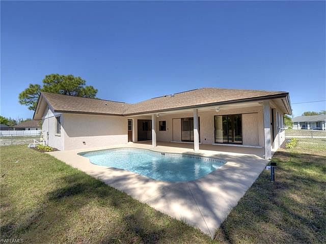 WOW! FULLY REMODELED POOL HOME with southern exposure in SW Cape Coral. This truly spectacular residence with 3 bedrooms all with walk in closets plus 2 upgraded custom tile bathrooms on a large 10,000 sq. foot lot could easily be featured in an HGTV segment - Highly upgraded interior finishes include new kitchen with white shaker cabinets with soft close, designer back splash, quartz countertops, and brand new stainless steel appliances. All new beveled and distressed REAL hardwood flooring throughout the home and into master bedroom. Master bathroom spares no detail with custom "waterfall effect" shower with frameless glass door. Framed mirrors with quartz in both baths and large walk-in closets in every room. Recessed lighting and custom lighting accompany an electric fireplace and so much more! New exterior paint, landscaping and brand new plumbing throughout home. New pool with oversized lanai area accompany lots of open yard that is perfect for entertaining! Yard completely fenced for privacy. Excellent location in desirable SW Cape. This house is a Easy show and won't last.