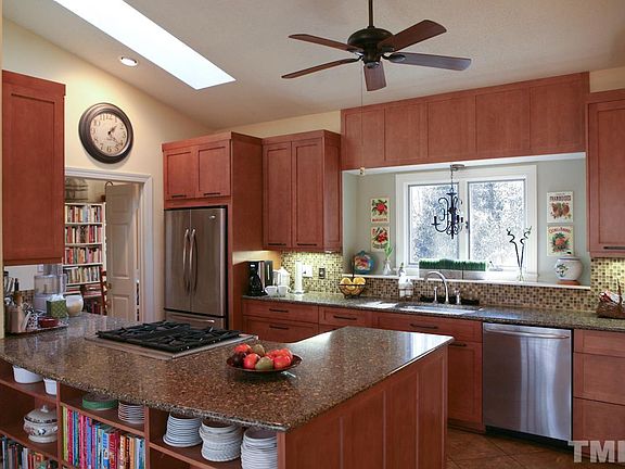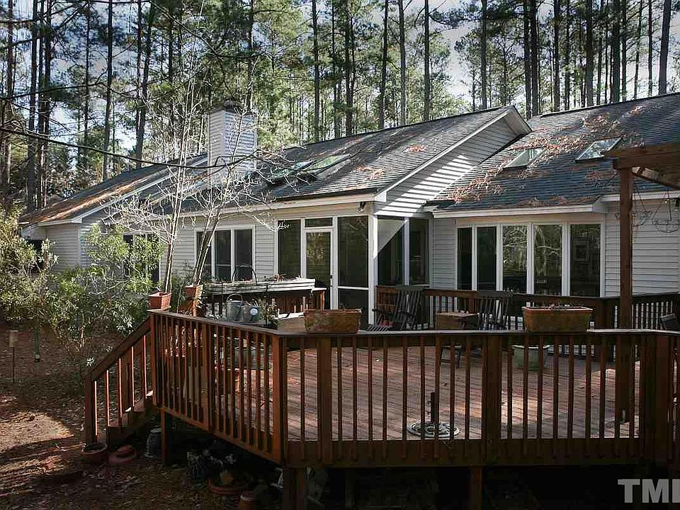 Beautifully updated, 1 story, 3BR/2BA home on private lot. Cook's kitchen w/quartz countertops, gas stovetop, maple cabinets & adjacent office. Fabulous sunroom. Two sided gas fireplace, cherry wood floors. Vaulted ceilings & skylights give open, airy feel. Boxed bay window in MBR ideal for desk/dressing table overlooks private woods. Updated MBA shower. 2 car garage. Large deck. Awesome home great for entertaining!