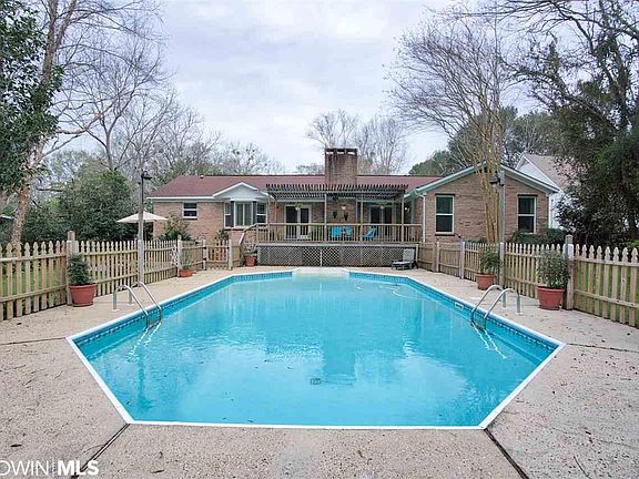 This home is a rare find in the heart of Fairhope. Located on a quiet street this home features 4 bedrooms (2 of which are ensuites) 3 1/2 baths and sits on a deeded half an acre. Great entertaining home with a large living area, designated bar area, wood burning fireplace, large (25x12) covered back porch and saltwater pool. The large master bedroom features hardwood floors, walk-in closet, updated bathroom with a large walk-in shower and door that leads to the back porch. The garage has new reinforced garage doors, sink and a door that leads to the side of the home. Some of the updates include; two A/C units for efficiency, 2 hot water heaters, electrical, plumbing, new windows, storm shutters, painted exterior, new pool liner, Polaris, and pool pump. The lot is manicured with fruit trees and blooming shrubs. Seller will provide a one year HOME WARRANTY. Don't miss out on this once in a lifetime opportunity to own a move-in ready, half acre deeded lot, close to downtown Fairhope and Mobile Bay.