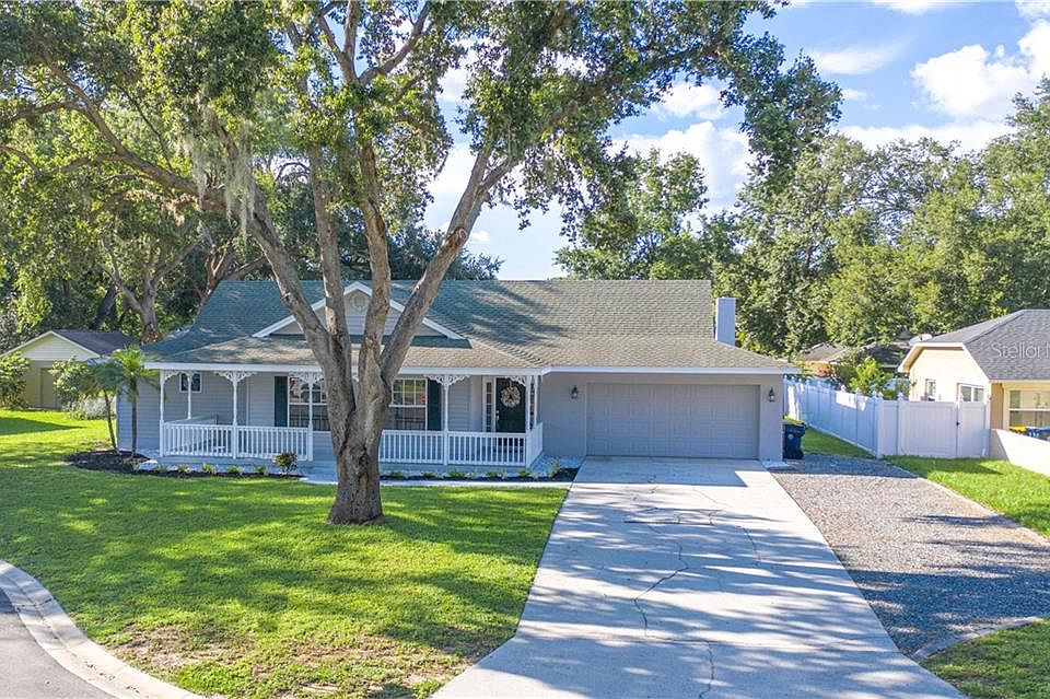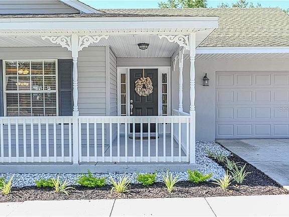Enjoy the desirable Kirkland Lake Estates neighborhood from the covered front porch of this beautiful home that sits on .29 acre lot on a cul-de-sac. This split-plan, 3 bedroom, 2 bath, 2 car garage home with a beautiful enclosed pool area boasts a formal living/dining room area with french doors to the pool, and a large family room with a fireplace and eating area. The kitchen has a breakfast bar, closet pantry, and a window overlooking the pool. The master bedroom has french doors to the pool area with a master bath with dual sinks, a walk-in shower, and lots of space in the walk-in closet. On the other side of the home are two guest bedrooms, and the guest bath has a walk-in shower and pool access as well. The large pool area is great for outdoor entertaining with lush landscaping, a lovely waterfall and an outside pool shower. From the pool area, you can follow pavers to the 16'x16' detached, concrete block workshop that has a window A/C and electric. In addition there is a separate utility shed, and the property has an irrigation system. This property has so much to offer, and at this great price, this beautiful home won't last long!