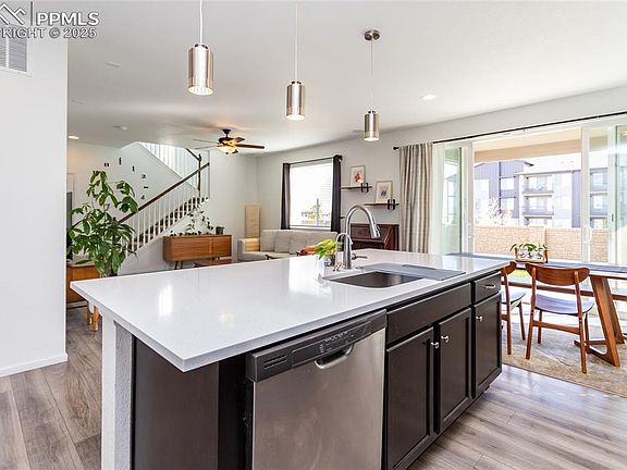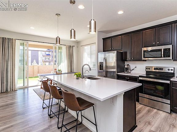 This beautiful home is filled with upgrades and modern features throughout! The main level showcases luxurious wood LVP flooring and an open-concept design perfect for entertaining. The gourmet kitchen features expansive white quartz countertops, a large island with breakfast bar, a walk-in pantry with a stylish barn door, and sleek finishes that will impress any home chef. Upstairs, the spacious primary suite is a true owner’s retreat, complete with an oversized walk-in shower, extended walk-in closet with custom built-in shelving, and a serene atmosphere to unwind. The upper level also includes a versatile loft/family room, ideal for movie nights or a home office. Additional features include a radon mitigation system, central air conditioning, and an automatic sprinkler system in both the front and backyard. The outdoor space is fully landscaped and designed for enjoyment—step through double 4-panel sliding doors to the extended, covered concrete lanai with lighting, perfect for relaxing or entertaining. This home offers majestic mountain views, including stunning vistas of Pikes Peak. A perfect blend of luxury, comfort, and Colorado living!
