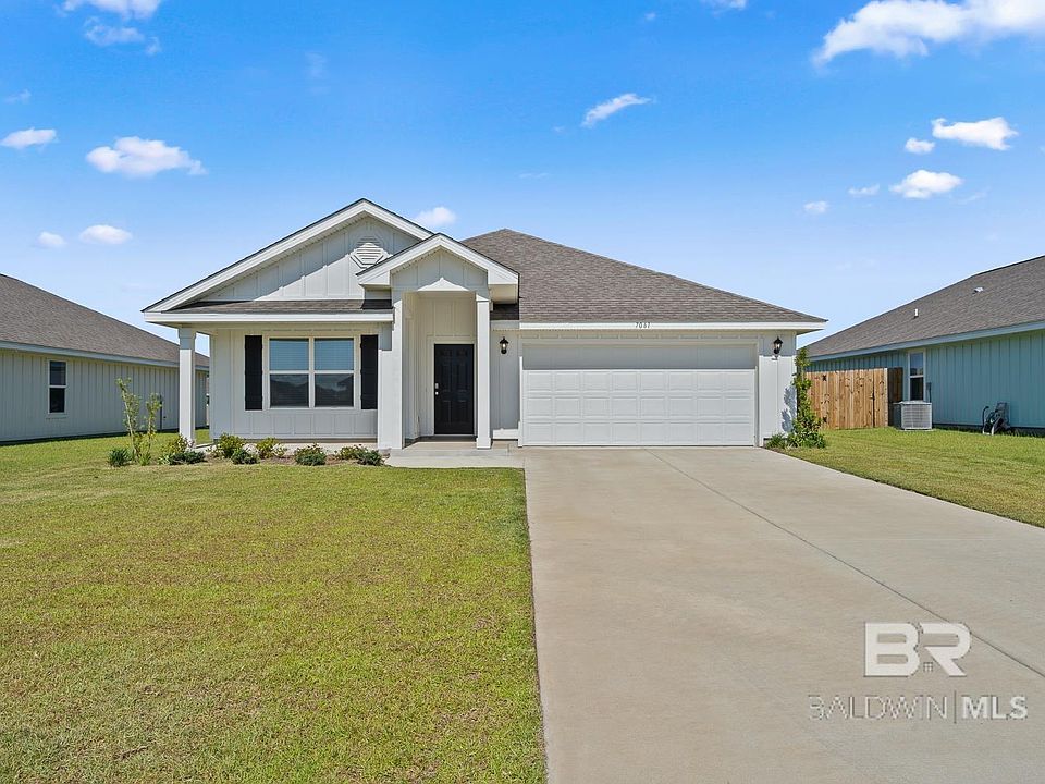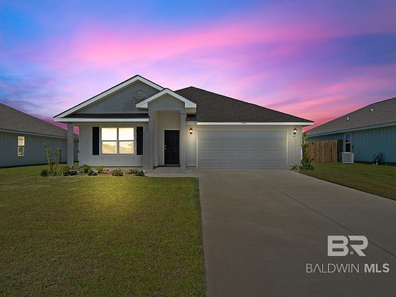 Welcome to Raley Farms! This home features a 4-bedroom, 2-bathroom, open and split floor plan, embodying stylish simplicity. Constructed to GOLD FORTIFIED standards, significantly reducing your homeowner's insurance premium. The interior boasts luxury vinyl plank flooring throughout the home. The spacious, open kitchen includes a large island, Moen faucets, a garbage disposal, a stainless steel dishwasher, an over-the-range microwave, and a smooth top electric range. The large master bedroom features a spacious master bath with a 5-foot shower, soaking tub, double vanities, and a roomy walk-in closet. Additional features include LED lighting, a double-car garage, vinyl-clad low-E double-pane windows, and a partially fenced-in backyard. The home is equipped with Smart Home Technology, which consists of a control panel, ring doorbell, smart code lock, and web-controlled thermostat, all manageable online. The Raley Farms community amenities include a fenced-in, zero-entry swimming pool with lounge chairs and a covered gathering area with tables and chairs. Conveniently located on County Road 8, this community is just minutes away from beautiful white sandy beaches, fantastic restaurants, excellent shopping, and is in the desirable Gulf Shores School District. Buyer to verify all information during due diligence.