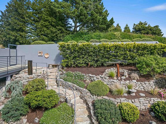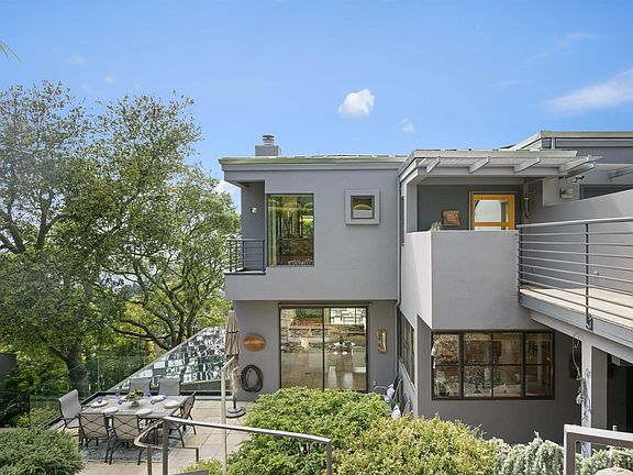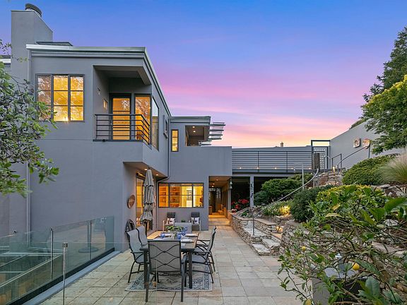 This stunning 3BD +office, 3.5BA contemporary residence nestled in the Oakland/Berkeley Hills is an entertainer’s dream. The home with plenty of natural light feels spacious with nearly 3,400 SQFT and almost every room having awe-inspiring views. Experience a unique sunset every evening, along with memorable SF Bay, bridges, and SF Skyline views. Many family events were celebrated in the open gourmet kitchen with oversized island and top of the line appliances. Spaces to gather include the dining area, glass-enclosed sunporch, formal living room, family/TV room, art touched courtyard, terraced landscaped garden paths, and multiple view decks that offer serene indoor-outdoor living. The office stuns with floor-to-ceiling windows, while an elevator with a view connects all three levels for total convenience. The primary suite features a spa-like bathroom with heated floors and a spacious custom walk-in closet. Enjoy year-round the indoor heated endless pool and an outdoor hot tub—both with breathtaking views. The hall bath features a sauna & jetted soaking tub with views. Sustainably equipped with solar panels, 3 Tesla Powerwalls, 3-zone central heat & A/C, and a central vacuum system. 2 car garage, plus large driveway. The lush lot parcel below is included to offer more privacy.