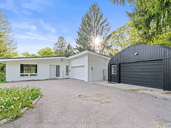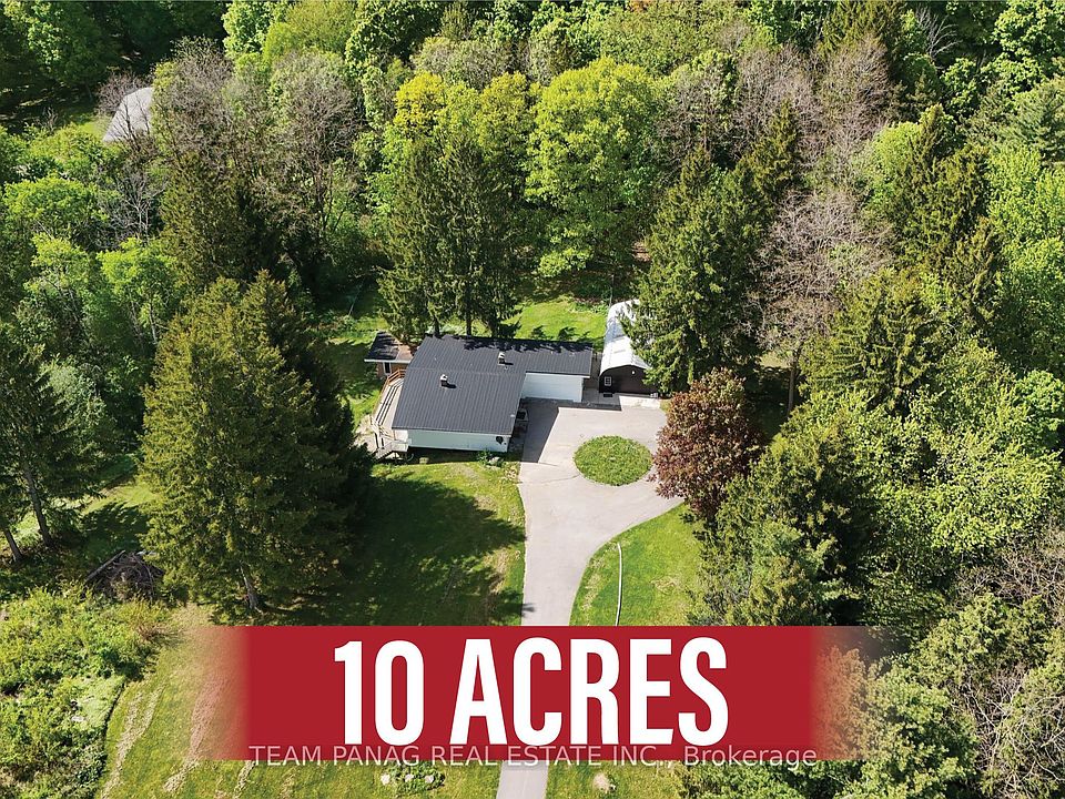 Nearly 10 acres of scenic countryside in Caledon offer the ultimate in privacy and tranquility, nestled among towering mature trees just minutes from Caledon East, Brampton & Bolton. This spacious bungalow features a large living room with expansive windows, an elevator, and a functional kitchen that opens onto a secluded deck perfect for taking in the natural surroundings. With no nearby neighbors, peace and seclusion are guaranteed. The second bedroom on the upper level was previously two separate rooms and could be converted back if desired.The finished walk-out basement includes a separate entrance, a cozy rec room with a wood-burning fireplace, two bedrooms, and two bathrooms. Enjoy direct access from the oversized garage, along with a separate workshop ideal for hobbyists or equipment storage. The gated circular paved driveway provides ample parking, and the backyard includes a fenced area for animals. With frontage on two roads and located on a quiet paved sideroad, this property offers a prime opportunity to build your dream home or generate rental income. Ideally situated close to Caledon East, Bolton, Toronto, and the airport! Come explore the exciting potential this unique property has to offer!