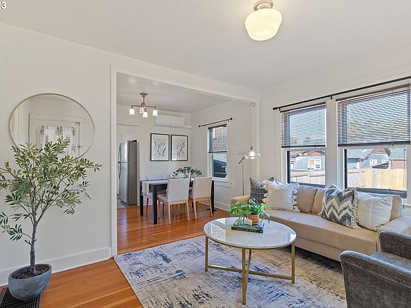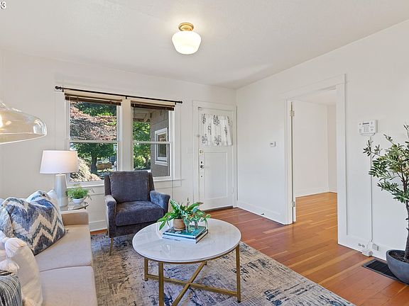Dekum Triangle: walk to shops and restaurants! Cute 2 bedroom bungalow has beautiful wood floors and open kitchen. Half basement w/outside entrance-could be finished! Hard to find extra large lot-with room to build a house in front and keep this one as ADU. Sellers have architectural plans ($16,000). Oversized garage. Mature fig, apple, plum, cherry trees. Fenced lot. Newer wiring, gas furnace plus heat pump, newer roof, stainless refrigerator &. Taxes only $1,700 in 2022!