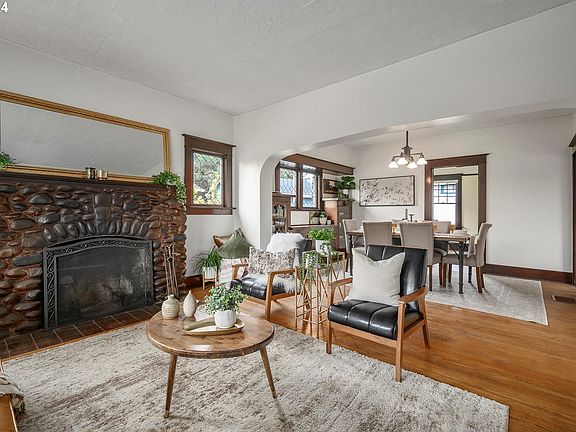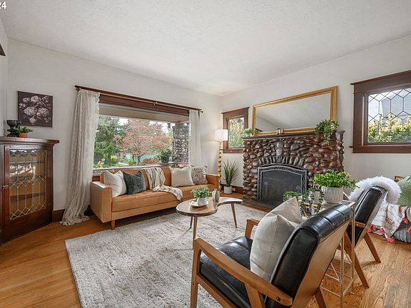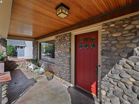 Step into relaxed vintage charm with this beautifully restored 1912 Craftsman bungalow, where historic preservation meets modern convenience. Previous owner was a master woodworker and completely restored/replaced the cedar shake exterior and the original river rock is truly one-of-a-kind. Beautifully preserved features in the formal rooms are just stunning. Massive river rock fireplace in the light and bright south facing living room, leaded glass built-ins, glass pocket doors, and warm tiger oak woodwork exude timeless character. Fir and oak floors flow throughout. The darling vintage kitchen, complete with a retro gas range, captures the heart of this home. The main floor offers a flexible layout, including a bedroom perfect for WFH, guest/flex space and a full bath. Upstairs, two spacious bedrooms await, including a huge hallway closet that's large enough to use as a yoga/meditation room or just fancy storage. Both bathrooms have original clawfoot tubs, period tile, and refurbished built-ins. Beautiful vintage light fixtures through-out the house! The tall, unfinished basement offers ample storage or room for future expansion. With recent updates including a high-efficiency gas furnace, radon mitigation system, new sewer line, a decommissioned oil tank, and a 200-amp electrical panel, this home is move-in ready with peace of mind. Outside, enjoy the lovely yard, complete with a chicken coop cleverly made completely from Rebuilding Center's used house parts and a detached one-car garage. This is a rare opportunity to own a piece of Portland’s history, with all the modern updates you need. Sweet location on a quiet street close to Montavilla, shopping, restaurants and easy access to the best of inner NE Portland! [Home Energy Score = 3. HES Report at https://rpt.greenbuildingregistry.com/hes/OR10083964]