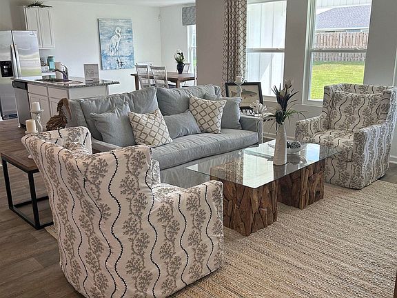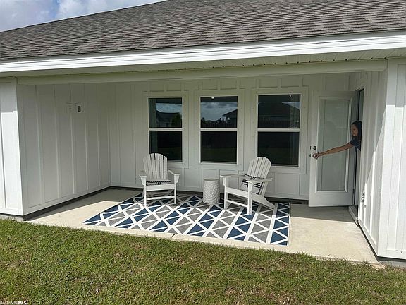 Welcome to Raley Farms! This brand-new development is conveniently located off county rd. 8 less than 15 minutes to sugar sand beaches and Gulf Shores City Schools. Enjoy sitting outside on the front or back patio all year long. Raley Farms features a zero-entry swimming pool overlooking a large, peaceful pond. This BRAND-NEW home offers 4 bedrooms and 2 bathrooms, a foyer that leads to an open living room and kitchen with a large pantry and an island with seating that overlooks the family room. You will find granite countertops & LVP flooring throughout. The primary bedroom suite has a large, attached bathroom, double sink vanity, 5