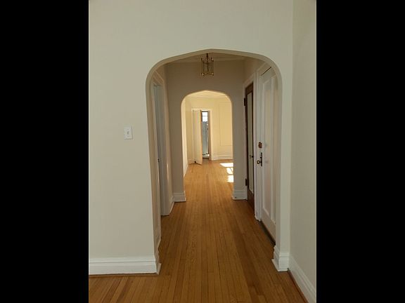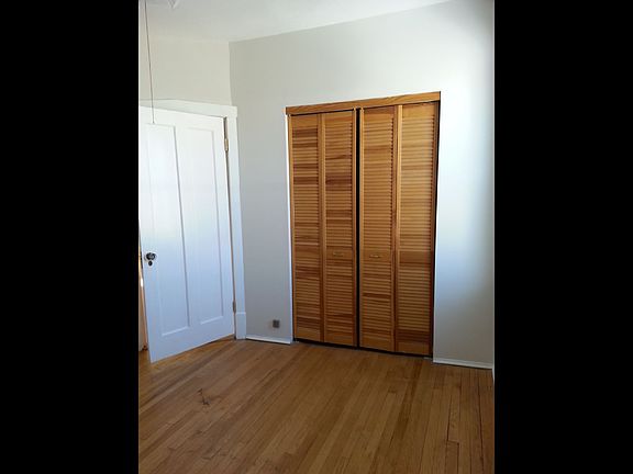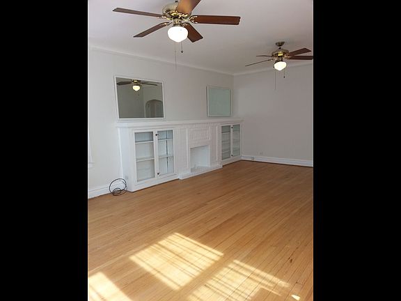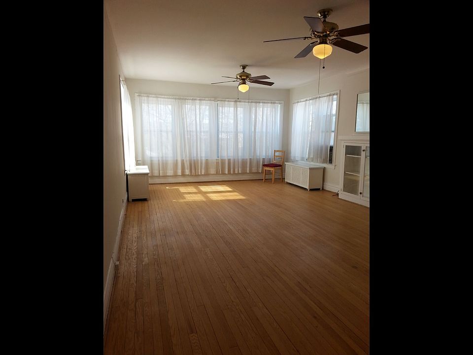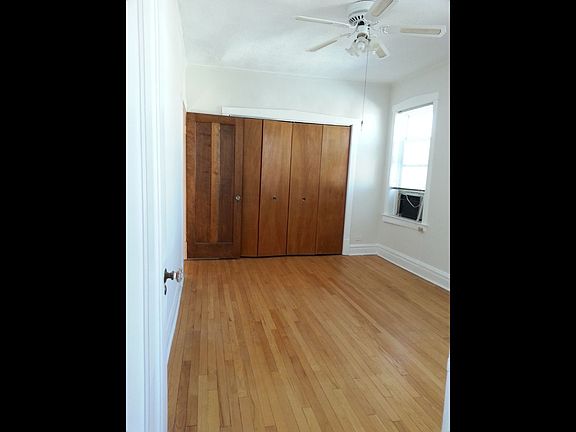 Spacious, sunny unit on third floor of owner-occupied 3 flat. 1400 square feet. High ceilings. Hardwood floors. Ceiling fans in living room, bedrooms and kitchen. Two large bedrooms with deep closets, plus two hall closets. Living room has decorative fireplace with built-in cabinets. Formal dining room. Eat-in kitchen includes dishwasher, gas stove, refrigerator. Additional rear three seasons room. Rear deck. Heat , Water, free onsite laundry, and large basement storage room included.. One garage spot available for $100.