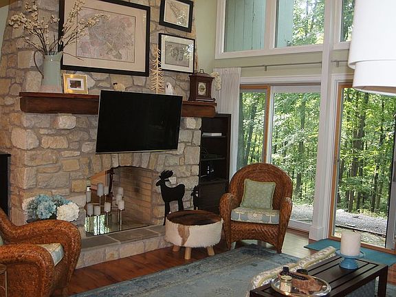 Tree Top Contemporary on 2 acre wooded lot. Vaulted ceilings offer lots of light and plenty of windows. Natural setting with native plants and dogwoods, protected by deer fencing. Both family room and bedroon are sky lit rooms with private balconies. The family roon has an antique brick fireplace. The lower level living room is open two stories and has an impressive stone fireplace. The kitchen and dining room open to the rear deck and private yard. The oversized garage offers pleny of room for storage or workshop. Current owner has made major improvements over the last 11 years of ownership. Complete list available. HSA one year Home Warranty Included Home now vacant and early settlement possible