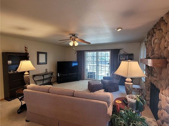 Beautiful condo, open floor plan, fully applianced kitchen with bar overlooking dining area & living room with stone fireplace with sliding doors to covered rear patio with wooded view. 1st floor Master Suite with shower & walk in closet, 1st floor laundry, 2 more bedrooms both with double closets, Lower level rec room. 1 year home warranty.