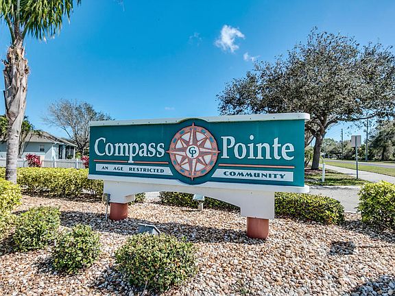 Very Active 55+ Community. One of the better lots in COMPASS POINT! It's high and on a corner with the gate nearby. Nice views of water from the front door & screened lanai. Extra widened driveway. Features include tile floors throughout, no carpet! Newer SS refrigerator, microwave and disposal. Clean white kitchen cabinets with eat in kitchen. Master Bath has double sinks and walk in shower. 16 seer A/C heat pump replaced in 2009 w/10 year warranty. Accordion hurricane shutters and 3M window film. Also features a nice enclosed porch AND a screened in Lanai. Laundry room w/ Washer & Dryer with extra shelving. Hip roof allows for lower insurance. Amenities include, gated entry, clubhouse, heated pool w/ hot tub/spa, shuffleboard, horseshoes, exercise room and putting green.Fantastic