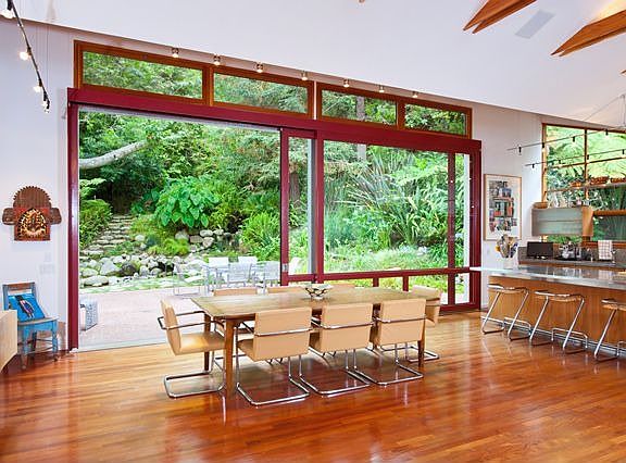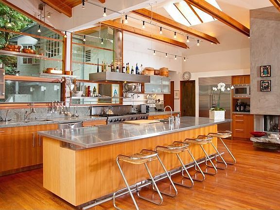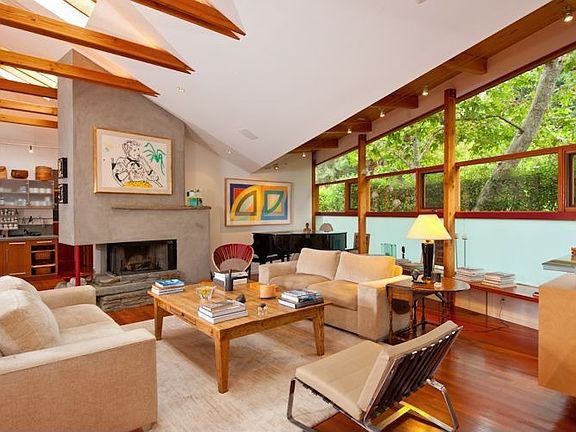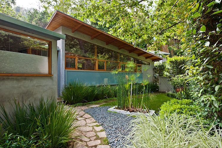 Griffin Enright Architects designed Rustic Canyon home. The property pays homage to the majestic 300 year old wandering sycamore that shades a small spring and lush slope in the back. The interior of the house is centered around a fireplace of stucco and rough stone, the living, dining and kitchen areas flow together effortlessly. Each area has a unique view of the ancient sycamore, thanks to sliding glass barn doors that are so generous – 10 feet by 10 feet – they had to be built on-site. The custom kitchen showcases a long stainless-steel island and hidden storage. A library sits between the living space and the master bedroom. Here, another wall of glass affords a closer perspective of the tree and frames a “floating” fireplace. Two solid walls of books flank the fireplace. The bedroom is more intimate, canopied by a pitched roof. A clerestory window adds light and a skylight offers view of the sycamore branches. The fireplace has been uniquely designed so that the angled flue intersects shelves of birch. The dappled light in the morning sunlight or glowing lantern-like at night is spectacular, like sitting under a tree in the forest. The versatility of the house adapts to 50 of your closest friends as comfortably as it accommodates two.