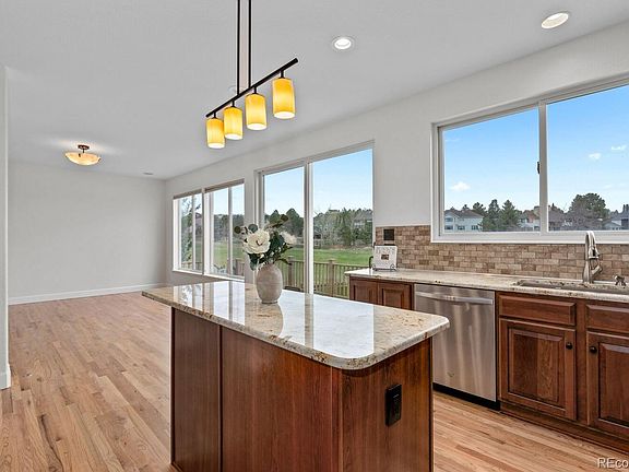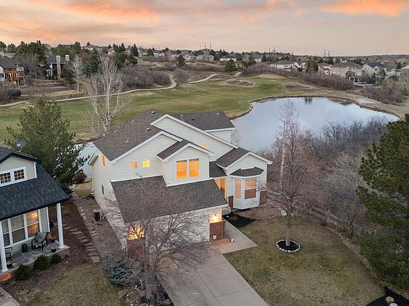 Experience breathtaking views and refined living in this beautifully updated two-story home, boasting over 3,400 sq. ft. of thoughtfully designed living space. Nestled along an award-winning, pristine golf course with a serene lake backdrop, this five bed, four bath residence offers the perfect blend of comfort and elegance. Enjoy the gorgeous Colorado sunsets and full lake and golf course views from your deck! Step inside to find newly refinished hardwood floors, fresh paint throughout, and plantation shutters that enhance the home's timeless appeal. The open-concept floor plan features a spacious living area, formal dining room, family room with gas fireplace, kitchen with island, double-oven induction range, and ample cabinetry. The expansive primary suite provides a peaceful retreat with stunning lake and golf course views, and a new bath tub. The finished basement adds valuable living space with a kitchenette, fireplace, and plenty of room for guests or entertaining. Outside, the south-facing orientation fills the home with natural light. Miles of walking trails are just steps from your front door! A home with such an amazing lake and golf course view is a rare find not only in the Castle Pines community, but in the Denver community as well!