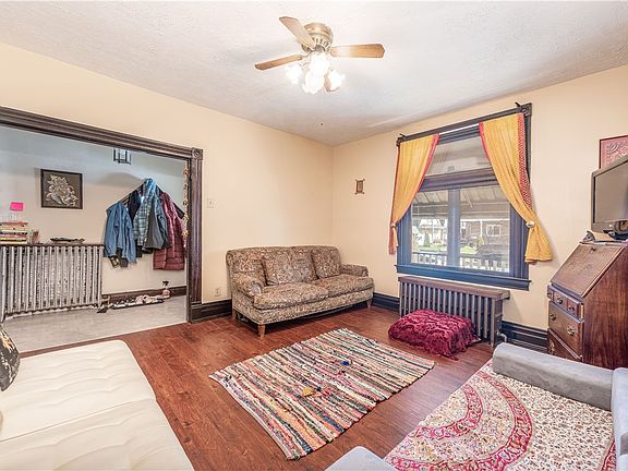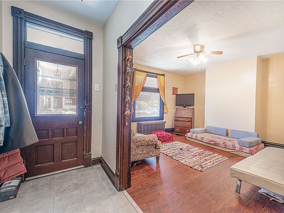 Welcome Home! Upon entry you will be invited by a covered front porch and enter into an updated 1st floor with large room sizes, high ceilings, and ample natural light. The first floor features an updated eat in kitchen with 17 cabinets, a new backsplash, new counter tops, range hood, new flooring, stove and dishwasher. The dining room boasts beautiful new flooring, a decorative fire place and fabulous chandelier, with an added powder room off the dining area, step into the large living room with high ceilings, and a large picture window. The second floor features 2 large bedrooms and 1 captive room that can be used as a 3rd bedroom, office, nursery, or a closet. There is also a full bath on this floor with the original claw foot tub. The third floor of the home is unfinished but with a little personalized touch of your own would make a great play room or just added storage. Investor special for a quick flip.