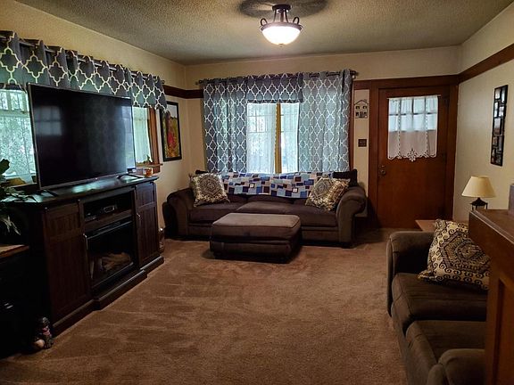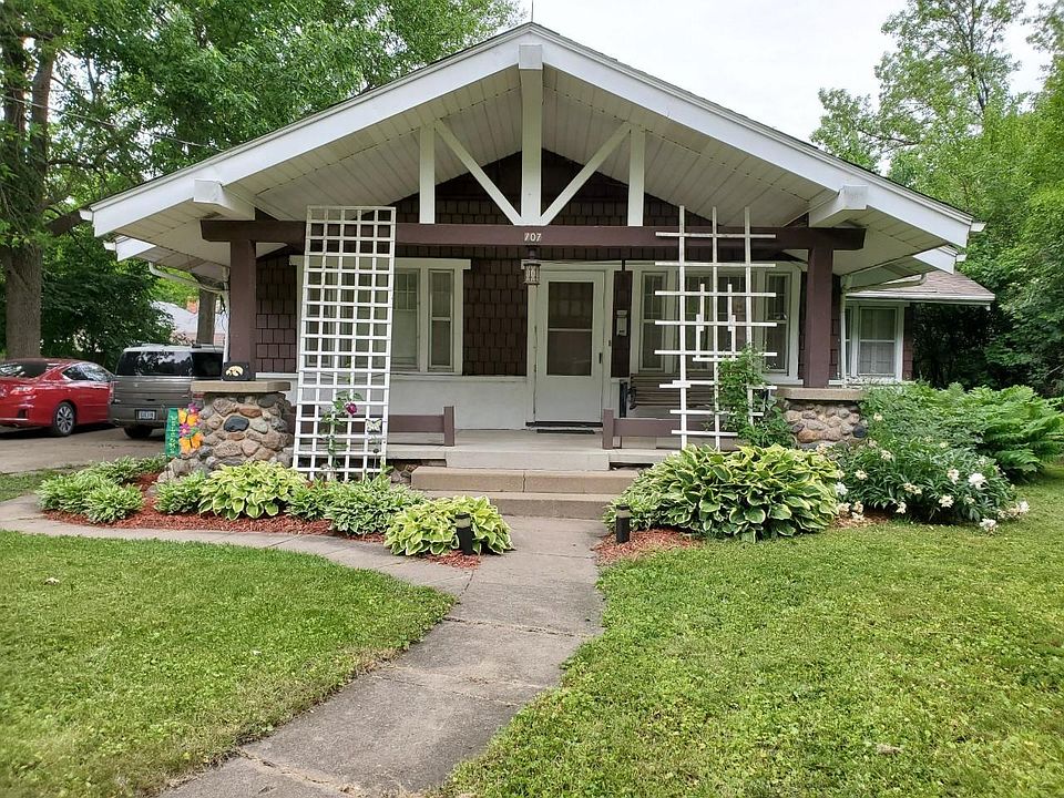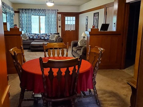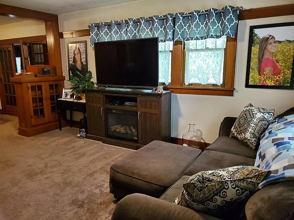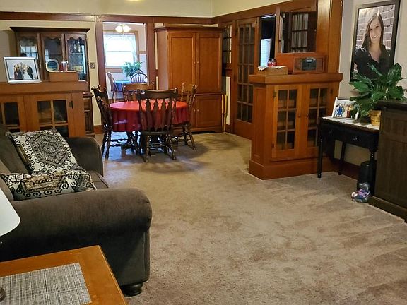 You will love this Craftsman style home with beautiful woodwork throughout. The Living room opens to a formal dining room through Oak Colonnades with unique built-in display cabinets. French doors separate the formal dining room from the Sunroom which could be used as a third bedroom. The eat-in kitchen has lots of storage and newer floor tile. Two large bedrooms with oversized closets. One full bath with recent updates. The lower level has lots of storage. Other updates include new carpet throughout, newer roof, newer furnace / Ac, some newer plumbing, and new interior paint. With all that done you can relax on the huge L shaped deck while watching the kids in the above ground pool. Need a quiet place to read your book? The covered front porch is just the place. Oversized lot with apple,