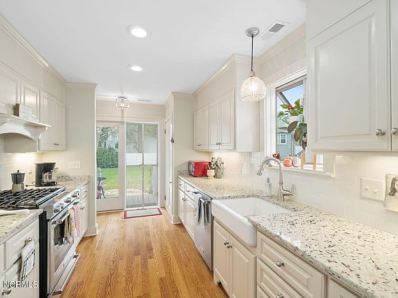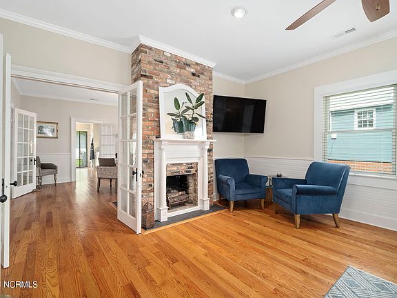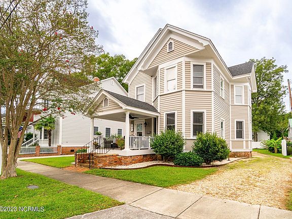 Welcome to Saint Cyprian Rectory, one of the most historically significant properties in Downtown. Originally located on the site of Saint Cyprian Church, among the first African-American Episcopal churches in North Carolina, this residence was moved in the 1990s to its current address and converted to a single-family home. Updated, in PRISTINE condition, and located right across from the Neuse River, this home is the ideal combination of historic features and modern conveniences. You and your visitors will be delighted by the welcoming front porch which creates the perfect entry to the interior with its beautiful wainscoting, moldings & doors and multiple fireplaces with stunning brick surrounds. Invite guests to dine in the elegant formal dining room or enjoy modern amenities in the updated kitchen with dining nook. Take advantage of the den with pretty built-ins for work, entertainment or relaxing. Upstairs, you'll find three generous size bedrooms including a primary bedroom en-suite. All bathrooms are nicely updated. As if all that is not enough, this home has also been updated with modern conveniences including exterior entry cameras and a Bluetooth system to enjoy music outside and inside. Situated on a large lot with a shed for woodworking, tools, etc. and lots of parking that may accommodate a garage (with HPC and City approval), the back yard with a porch and a great deck is perfect for entertaining. Located a stone's throw from the Neuse River and close to everything Downtown has to offer, including nightlife, dining and the riverfront, this beautiful home is move in ready for its lucky new owner. HPF Covenants apply.