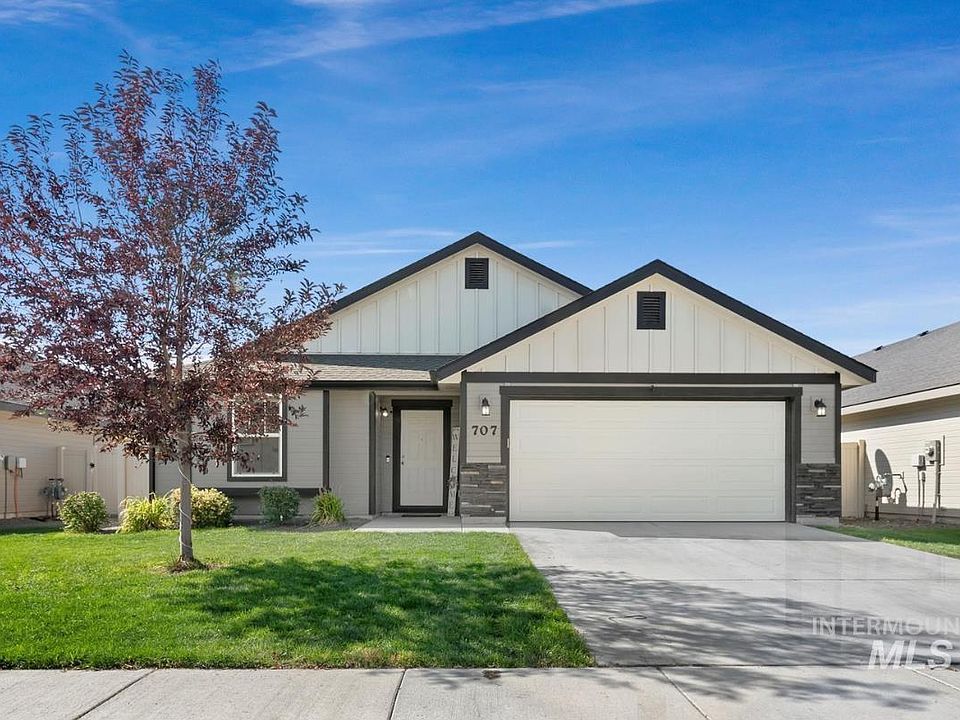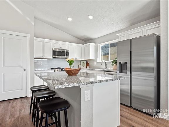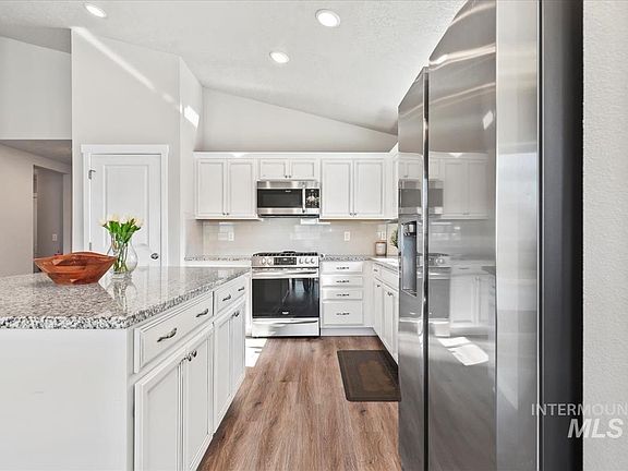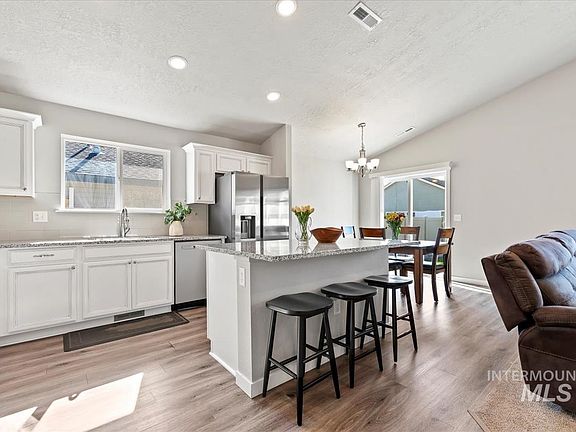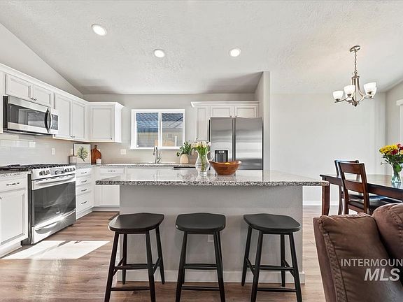 This beautifully maintained single-level home in Kuna offers 1,620 sq. ft. of thoughtfully designed living space with an open-concept layout, soaring vaulted ceilings, and abundant natural light. The kitchen features granite countertops, stainless steel appliances, and a large island that opens to the dining and living areas - perfect for entertaining or everyday living. The private master suite includes a dual-sink vanity, walk-in shower, and relaxing soaking tub. Enjoy sizable secondary bedrooms and a well-appointed secondary bath with granite countertops. Step outside to the fully fenced backyard with a pergola-covered patio - ideal for BBQs or quiet evenings - and a dedicated dog run for your four-legged friends. Conveniently located in Greyhawk Subdivision, tucked off Meridian and Kay, this charming home sits directly across from the community park and playground and offers quick access—only 10 minutes to the I-84 freeway and just 5 minutes to downtown Kuna.