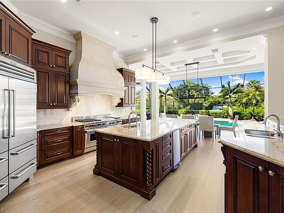 Completely reimagined and renovated by BCB Homes, this premier 1.3-acre corner lakefront estate in Pine Ridge offers western exposure and sweeping sunset views. An extensive 2020 renovation added wide-plank engineered hardwood flooring throughout, fully remodeled bathrooms, along with quality upgrades that reflect thoughtful design and craftsmanship. Interior features include a fireplace, volume ceilings, art lighting, a temperature-controlled wine cellar, and a gourmet kitchen with high-end appliances—ideal for both everyday living and entertaining. The flexible floor plan includes a dedicated exercise room, a private loft suite with sitting area, and a second primary suite with morning bar, providing excellent guest accommodations or a private retreat. Designed to blend timeless architecture with modern sophistication, the residence is surrounded by lush, professionally landscaped grounds offering privacy and tranquility. Additional features include a circular driveway, oversized 2.5-car garage, whole-house generator, large air-conditioned storage area, and a dedicated dog room. X-Zone property—no flood insurance required. A rare Pine Ridge offering combining premier location, space, privacy, and quality—ideal as a primary residence or luxury retreat.