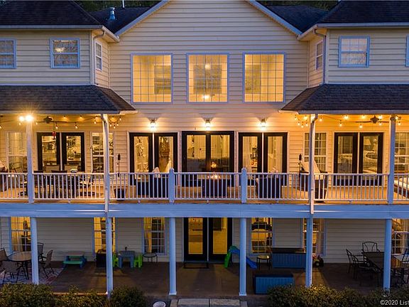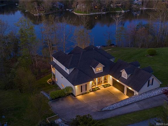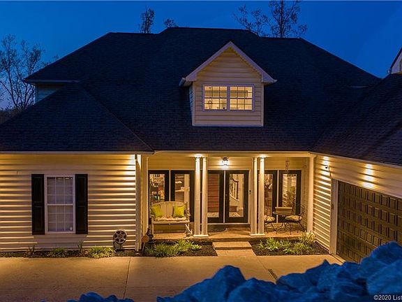 This gorgeous home at the foot of the knobs sits in a sprawling neighborhood on a private, fully-stocked, 90 acre lake. The grand entrance boasts hardwood floors and a beautiful staircase leading to a landing overlooking the view. Host in the newly renovated kitchen or take guests to the entertainment area downstairs which is complete with a theater room, bar, and a second living room. The first floor master bedroom and bath is secluded from all other bedrooms. The second floor master bedroom and bath has a lovely view of the lake. The bonus room can be converted to fit any needs - bedroom, office, or storage. The attached three car garage space is deep. The utility garage is perfect for additional space and storage. Enjoy peaceful mornings on the covered back patio and quiet evenings at the backyard fire pit. This home has had many renovations since 2017: remodeled kitchen (new hardwood flooring, granite countertops including island, granite sink with tall faucet, all new appliances, painted cabinets with new hardware, slate backsplash, new lighting fixtures), remodeled master bath (new tile flooring, new marble top double vanity, new shower with two shower heads, new tub surround), new flooring throughout (hardwood, tile, and carpet), fresh paint throughout, built-in entertainment center, newly built bar/kitchenette in basement with granite countertops, new aluminum fencing, new doors on main level, steps from road to driveway, and printed concrete added to front porch.