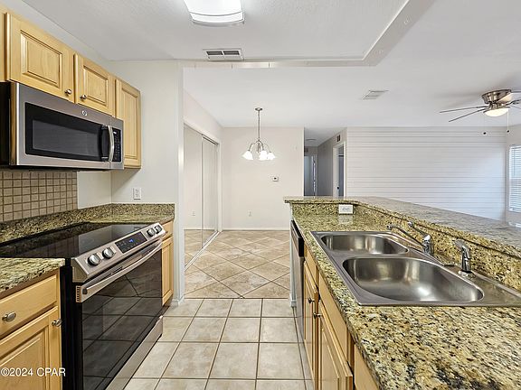 This ground floor condo in Nautilus Cove is less than 1.5 miles from Pier Park and walking distance to the beach! The open living area, dining room and kitchen are spacious and inviting. Featuring granite countertops and stainless appliances with an upgraded set-in range/oven, the kitchen is well equipped and ready for cooking! With three bedrooms and two bathrooms the unit also has privacy and with a split floor plan! The flooring is tile throughout with durability and easy maintenance for those sandy feet from the beach! The storage space in the unit is plentiful with a large storage space off the hallway and it even has a coat closet at the front door. Nautilus Cove is a highly desired gated community with amazing amenities that include a large resort style pool, a club house that is furnished with a full kitchen, a fitness center, the children's playground and a pet friendly community offering walking stations for your furry friends. Centrally located on Panama City Beach, living in Nautilus Cove you'll have easy access to the beach, shopping, dining, and entertainment!