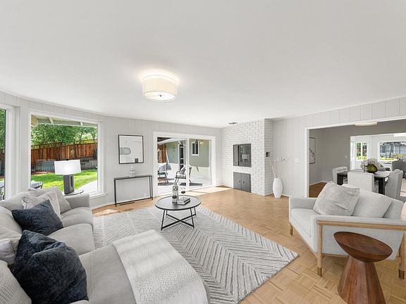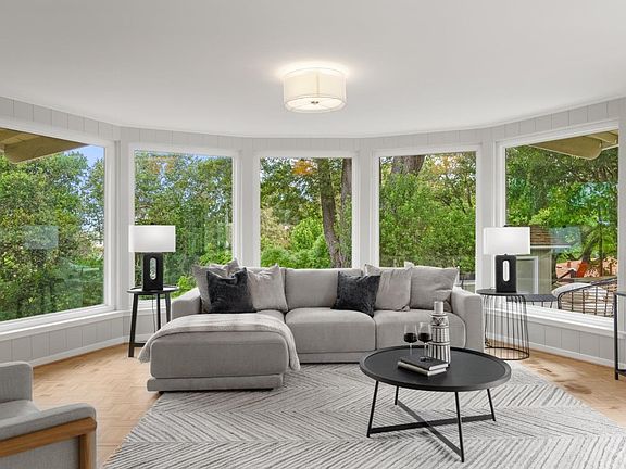 Expansive windows showcase stunning vistas, flooding the space with natural light that accentuates the home's inviting atmosphere and underscores its peaceful surroundings. The substantial lot boasts a meticulously maintained lawn and a charming patio, providing an idyllic retreat for peaceful morning coffees or lively evening gatherings.