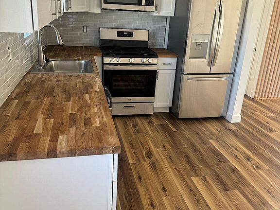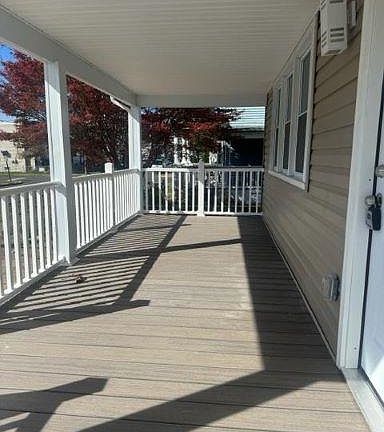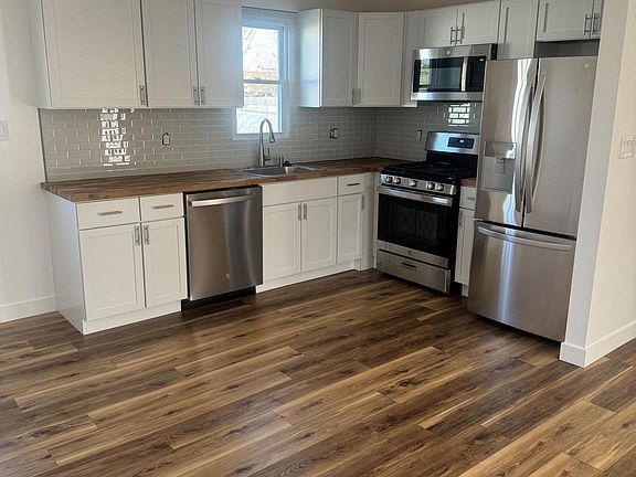 100% renovated! Four bedroom, 2 full baths. Enter from the front porch into a large open Great room showing a beautiful laminate floor. The open floor plan that can be a formal living room, a dining area that goes into a ultra modern kitchen. Two large bedrooms ,ceiling fan in each and a full size ceramic bath. The kitchen shows new cabinets , a butcher block counter top and SS appliances; a 4 burner gas range with a center grill, microwave exhaust, dish washer and a large SS double door refrigerator with a bottom freezer and a water purifier. The stair case goes to a laminated landing. There are 2 bedrooms with w/w carpets and a full shower stall shower. All is newly installed. The front has a lovely covered porch, 2 car concrete driveway. Off the kitchen is a concrete patio in the yard. All new vinyl siding, new gutters and down spouts, a new roof. In the full basement is the new high efficiency natural gas heater and central air unit, also the w/d hookup. The electrical system is 200 amps. The driveway is concrete giving off street parking for 2 Automobiles.