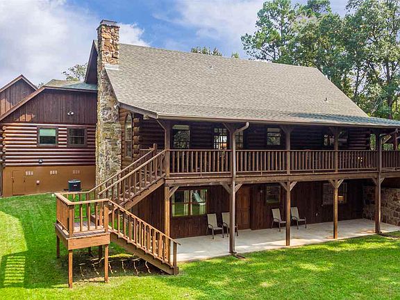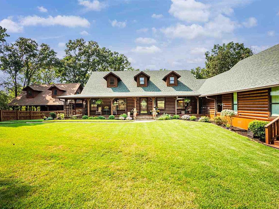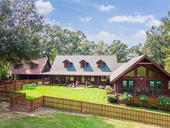 RELAX IN THIS GORGEOUS CUSTOM LOG HOME! This property boasts amazing views of rolling hills, babbling brooks and abundant wildlife. Situated on 10+ acres on the outskirts of Longview, this beautiful home was remodeled and a master en-suite added to the main level in 2013 and new flooring and interior paint in 2021. You will enjoy relaxing on walk-around porches and strolling stone walkways that blend into the woods to preserve the natural beauty of this prime area. As you enter thru a beautiful custom auto iron gate, the home features 4 bedrooms, two of which are master suites & 3 baths. Work from home in the designated office space, or you will love the additional 570 sq. ft. of heated & cooled living space above the 3-car carport, easily accessed from the main house. The loft above the kitchen is great flex space for children, home schooling or a just a private getaway. The beautiful kitchen/dining area is complete with granite counters, travertine floors, double oven, oversized island and a huge pantry. The primary bedroom offers its own private porch and sitting area, a large master bath with walk-in closet, walk-in shower, double vanities, and a soaker tub. The living area has a beautiful stone fireplace & soaring ceilings. Ample storage in the carport, a great workshop, and a 4-stall pole barn that will accommodate a RV is also a part of this wonderful property. Beautifully landscaped, fenced and cross fenced, there is always room for gardening or riding 4-wheelers around the property. ~Welcome Home~