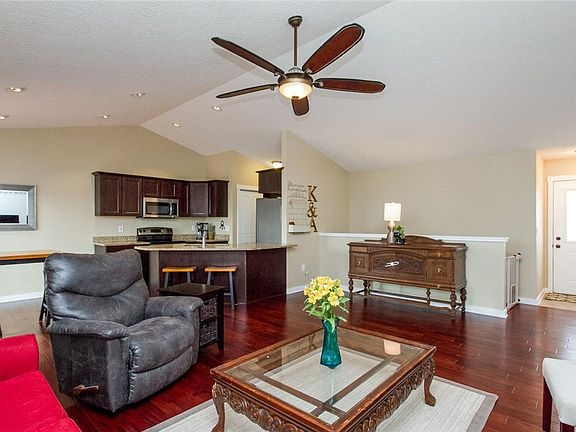 LOCATION! LOCATION! Better than NEW one owner ranch, w/low maintenance vinyl/brick exterior, in Deer Run N’borhood/SEPolk School District, is nestled on the edge of Mitchellville, w/easy walk to ball fields, parks & minutes to Elementary & Wildlife Refuge. Gorgeous espresso hand-scraped floors lead through vaulted great room to dining area off kitchen. Catch a quick snack at the bar seating in the kitchen w/granite counters, dark cabinets & stainless appliances. Laundry is right off attached garage that includes workbench. Retreat to the master bedroom w/private bath that includes tiled shower & cubbies for extra storage. 2 other bedrooms are near 2nd bath. Future finish walkout basement w/bathroom stub holds windows for natural light. Chill/grill on the 12x12 deck w/wrap around stairs leading to large manicured yard. NEW water softener, framed mirrors & ceiling fans in every bedroom are upgrades. Just minutes from big city amenities, this small town feel is your next Home Sweet Home!