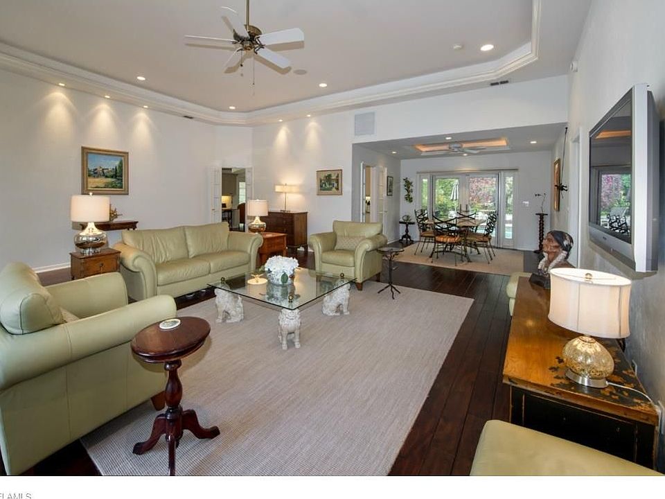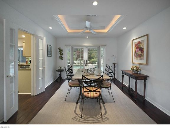 H.10594 - This single story residence with three bedrooms and a den is conveniently situated on one of the Moorings most beautiful, quiet tree-lined streets, walking distance to the beach and minutes drive from downtown Naples or Venetian Village with upscale shopping and entertainment. This home can address the needs of today's buyers or it could be a potential lot opportunity, if preferred. Quality renovations, move in ready, expansive floor plan with beautiful natural light, volume ceilings and rich dark wood floors; Well equipped kitchen serves both a formal dining room with french doors onto the lanai or casual family dining area/breakfast bar with large cathedral ceiling family room. Built in custom cabinetry and plenty of closet space. Private pool within a screened lanai for entertaining family and friends. Lush, tropical landscaping with a secluded backyard makes for a very private garden. Three car garage with circular drive in the front of the property. Private beach membership with the Moorings Property Homeowners Association available.