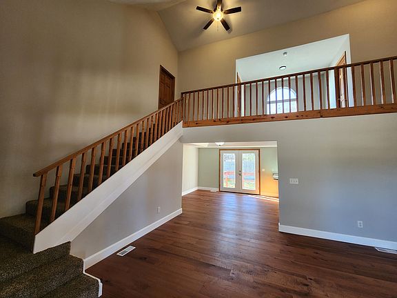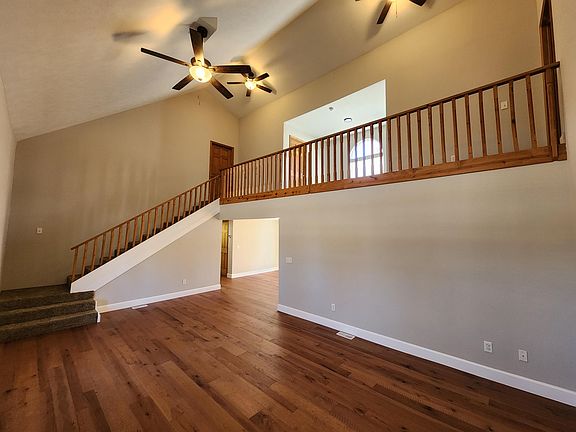 This beautiful home is ready for you to call your own. Walking across the covered front porch and through the front door is the large living room. With vaulted ceilings, a staircase and railing for loft-like upstairs makes it feel extravagant, the hardwood hickory flooring adds to that feel. 1 bedroom (with a huge walk-in closet) and 1 bath are on the main floor as well as the dining, kitchen, laundry and attached garage. Black Stainless kitchen appliances will stay including a WiFi double oven. Brand new HVAC unit! Central heat and air service the garage as well making it a really nice place to park out of the weather or use as a bonus room of your liking. The back yard is easily accessed out the back door via a small deck. The back yard is also completely privacy fenced and features a small burn pit to enjoy. Upstairs are 2 huge bedrooms that are large enough to be bunk rooms. An office, small living area and a bathroom lie between the 2 bedrooms. Giving this home an awesome layout.