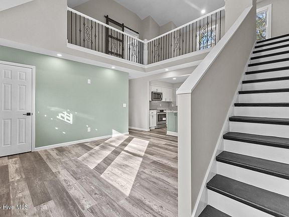 The 2nd floor is home to a large loft with open wrought iron railing and huge master bedroom with Barn door entry. The adjoining bath features LVP hardwood style floors, walk-in shower and custom white vanity cabinet with matte black faucet.