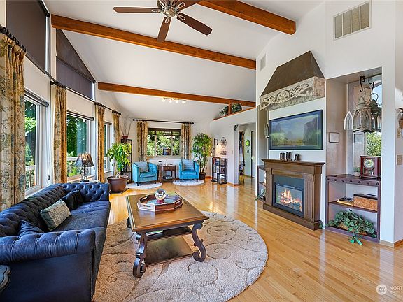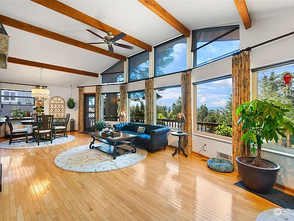 Spacious, stunning home with water, territorial & mountain views!! Dramatic great room with floor to ceiling picture windows, vaulted ceilings w/beam accents & gorgeous hardwood floors. Kitchen boasts tin ceiling, stainless steel appliances and center cooktop island. Extra w/d on main level for convenience. 2nd living space downstairs w/new carpet in 2022, kitchenette, 2 bedrooms, work out room w/sauna & large laundry room. Double decks are perfect for gatherings or just relaxing & enjoying the view. Oversize 3 car garage with center tall door for rv/boat parking. Low maintenance, no grass to mow yard. Walking distance to Martha's beach. Shelter Bay amenities include marinas, clubhouse, sports courts, 3 par golf course, beach access & more.