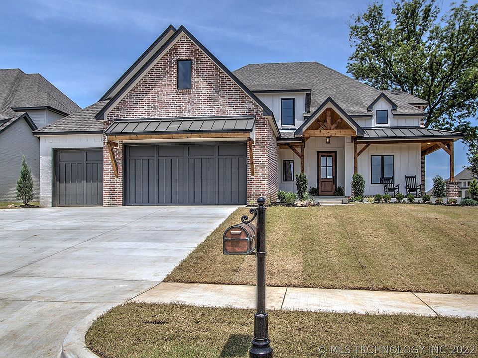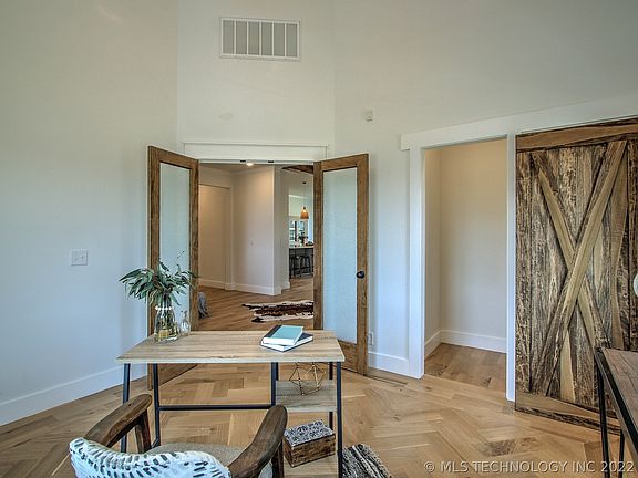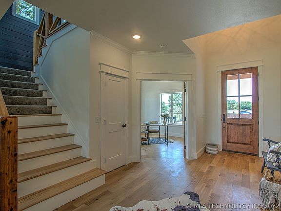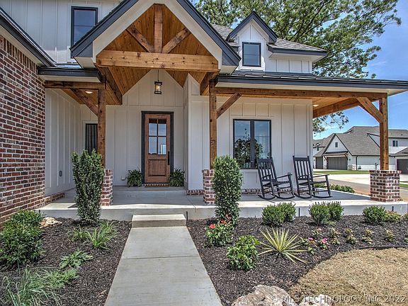 Breathtaking new construction home in Jenks w/ wrap around corner porch complete w/ pond views! 4 bd all w/ private bath! 2 bd up, 2 bd down, 12 ft office ceiling w/ pond view, loads of natural light, large rec room w/ reading nook up w/ attached theatre room, chef's kitchen complete w/ industrial built-in refrigerator, butler's pantry w/ sep walk-in pantry, tankless water, foam insulation, HE HVAC, 3 car garage, wood beams, gorgeous tile, brick floors in mud & utility convenient to HWY 75 and Creek TKPE!