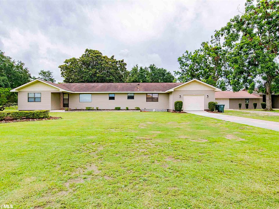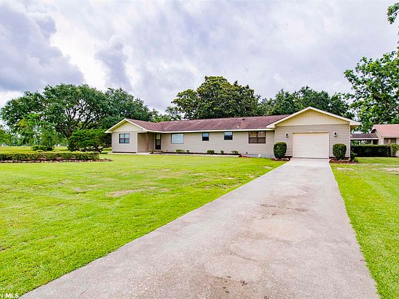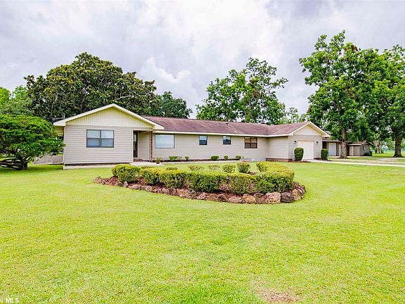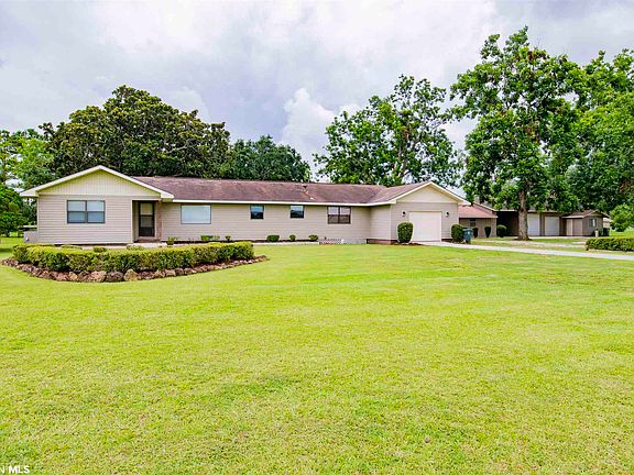 Looking for country living just outside of the Foley city limits. This is your property with a variety of citrus fruit trees, fig, and large pecan trees on 9.8 lush acres. 8 acres are farmable land, perfect to lease or farm yourself. 5 of the 8 acres are currently planted in centipede and St. Augustine grass, beautiful and easy to maintain. The property around the house is landscaped with many shrubs and large trees including azaleas, juniper, roses, and large oaks in the backyard for shade. Additional property features include large parking area for gatherings, a fire pit in the back orchard, and areas suitable for a garden, horses or livestock. The 1954 3 bedroom 2 bath house is built with sturdy heart pine, vinyl siding, and has a paved driveway to garage with auto opener. Features of the home include a gas hot-water heater, stove and central heat. AC and all other appliances are electric. The utility room includes washer and dryer hook ups, shelving a 4x4 shower, sink and commode. The office has rustic real wood paneling and shelves for photos or collectibles. The large sunroom faces south to the backyard giving access to the back patio and a 16x16 BBQ Shed with receptacles and lighting. The home is connected to two large metal shops by a covered breezeway. Both shops are approximately 27 x35 with cement floors. The first barn has rafter storage and sliding garage doors. The second metal barn has storage for an RV, trailers, lawn equipment or additional vehicles. An office extends from the front of the barn with a separate access to the outside. A large L shaped work area with shelves for storage is inside the barn. The back SW corner has an apartment with kitchen, laundry and bath downstairs and a bedroom upstairs. A gravel circle drive give access to both barns. City of Foley provides mosquito control, garbage collection, Fire and Police protection. Riviera Utilities. Great location near shopping, hospital, schools and entertainment venues.