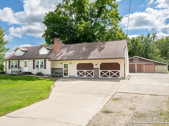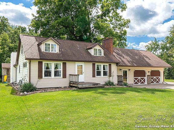 Located in a low traffic Belding neighborhood is this 3 bedroom, 2 bath, spacious cape cod home offering 2,088 sq' of finished living area. Many wonderful features including with this home: front living room with brick fireplace, main level 21.5x22 family/great room with second fireplace and pellet insert and sliders to patio overlooking fenced in yard with AG 18x33 pool and new liner summer 2021, Pella replacement windows, hardwood flooring, attractive kitchen with dining area and snack bar...all appliances included, natural gas, all public utilities including high speed cable/internet, all concrete drive leading to 2,5 car attached garage plus 32x40 pole bldg having heat and water plus 10x40 lean-to, house and building roofing approximately 8 years....a Great Place to Call Home!!