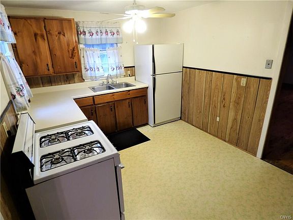 Cute ranch with 4 bedrooms, 1 full bath, eat-in kitchen plus formal dining room or craft room. Full basement, enclosed front porch, detached large shed. Nice level lot, newer double wide driveway. All public utilities, near small village park with swings and basketball. Main house heated with natural gas furnace & one room electric. Wood floors in living room & 4 bedrooms.