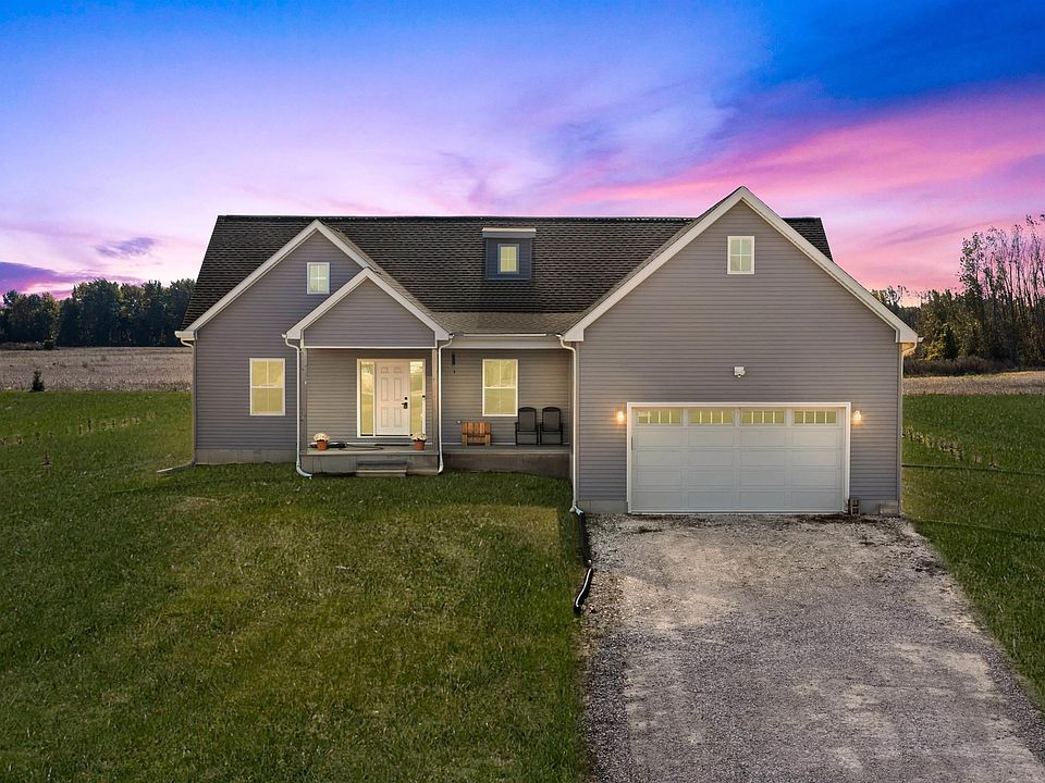 Get ready to fall in love with this like-new ranch home sprawled across 2 expansive acres! Step into the bright, open-concept kitchen with shiny quartz countertops and Kraftmaid soft-close drawers. The generous island with barstool seating invites casual gatherings, making it an ideal space for entertaining. For more intimate occasions, the charming breakfast nook offers a refined atmosphere. Soaring cathedral ceilings throughout provide a grandeur look and feel. The primary bedroom with convenient full bathroom is equipped with dual sinks, modern stand alone tub and giant walk-in closet. The basement is your blank canvas with tall 9 foot ceilings, already plumbed for an additional full bathroom. Enjoy the peace and serenity the backyard has to offer, a private retreat for savoring your morning coffee or evening cocktails!