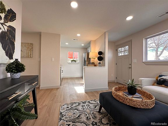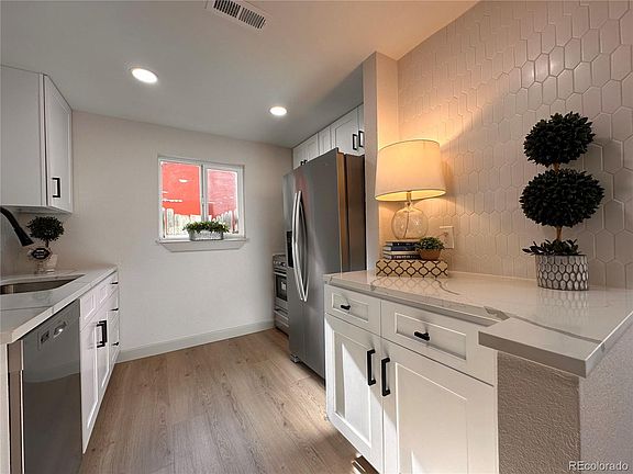Completely remodeled Commerce City Bungalow. This home is in a lovely neighborhood, and a growing area. It is new inside and out, and is move-in ready. This 896sf, one-level bungalow features a kitchen complete with new white cabinets, quartz countertops, stainless steel appliances and is flanked by an ample sized living room that has a very cozy feel to it. Down the small hallway you will find a large primary bedroom, a second good-sized bedroom and well appointed full bath. There is a rear entry that houses the laundry hookups, high efficiency furnace and hot water heater. Just a few steps outside the rear entry, you will find a synthetic turf area - great for relaxing in your private, fully fenced yard. A few steps further and you are at your single-car garage and enclosed parking area that is large enough to fit a few vehicles. The design of this home and finishes are clean, bright and upgraded. Come tour and see for yourself. The front of the home has a small concrete patio and grassy area great for relaxing outside and an inviting space for your furry friend(s)