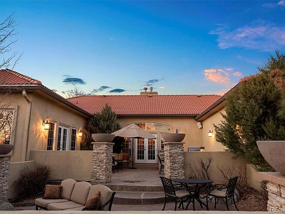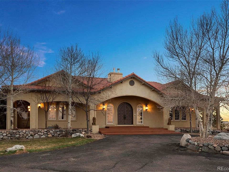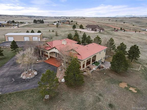 Absolutely stunning hacienda villa inspired estate perched on 7.23 acres in Black Forest w/ a 40x80 RV garage/outbuilding, professional mature landscaping, tons of phenomenal outdoor living space and full front range and Pikes Peak views. Italian imported tile floors, Mediterranean imported 8 foot arched knotty alder interior doors, 10 ft ceilings, 5 fireplaces, 50 year tile roof, high end arched metal clad windows w/ 3D panes, 11+ car garage, 3 ensuite bedrooms w/ walk-in closets, multiple walk-outs, plantation shutters, central air conditioning, multiple outdoor verandas, courtyard and patio. Large foyer with arched double entry doors, Italian tile and architectural niches. Gorgeous gourmet kitchen w/ a subzero refrigerator, high end maple cabinetry, Thermador double oven, Thermador 6 burner gas cook-top, granite counters, pantry, a custom vent hood and a walk-out to a veranda. Expansive great room with wood beamed ceilings, arched windows, stylish fireplace, hardwood floors and a walk-out to the courtyard. Amazing courtyard with an outdoor kitchen, outdoor gas fireplace, stamped concrete, water feature and stacked stone columns pre-plumbed for gas fire ambient lighting above urns. The outdoor kitchen has a fridge, storage, Thermador grill, pot boiler and concrete counters. Main level master suite w/ tons of natural light, a walk-out to the courtyard, a walk-in closet connected to the laundry room, fireplace and a 5 piece bath complete w/ a double vanity, over-sized shower and claw foot standalone tub. Secondary main level suite w/ walk-in closet and private bath. Fully finished walk-out lower level w/ a family room, office/craft room, an ensuite bedroom w/ walk-in closet, non-conforming bedroom or additional office, media room, a walk-out to the lower level stamped concrete patio w/ second outdoor fireplace. Family room w/ fireplace, pool table area, wet bar w/ custom mountain tile work. The property is zoned for horses. Award winning School District 38.